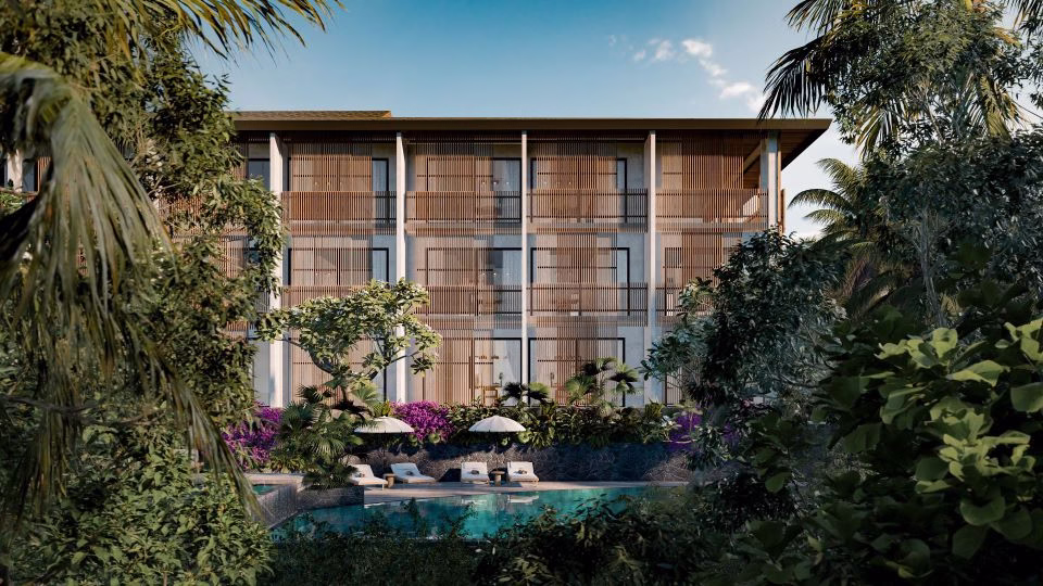 A three-storey apartment complex in the center of Bali – Ubud, located on a hill with panoramic views of rice fields and jungle.