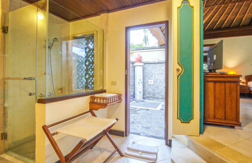 The Lobby is built higher than the villas and other resorts facilities. From there you can see the garden, the resorts temple with the open stage, Saraswati Bar & Restaurant, the pool, the sea on one side and rice field view on the other side. The Front office, that is connected with the lobby, will serve you all information and reservation activities.